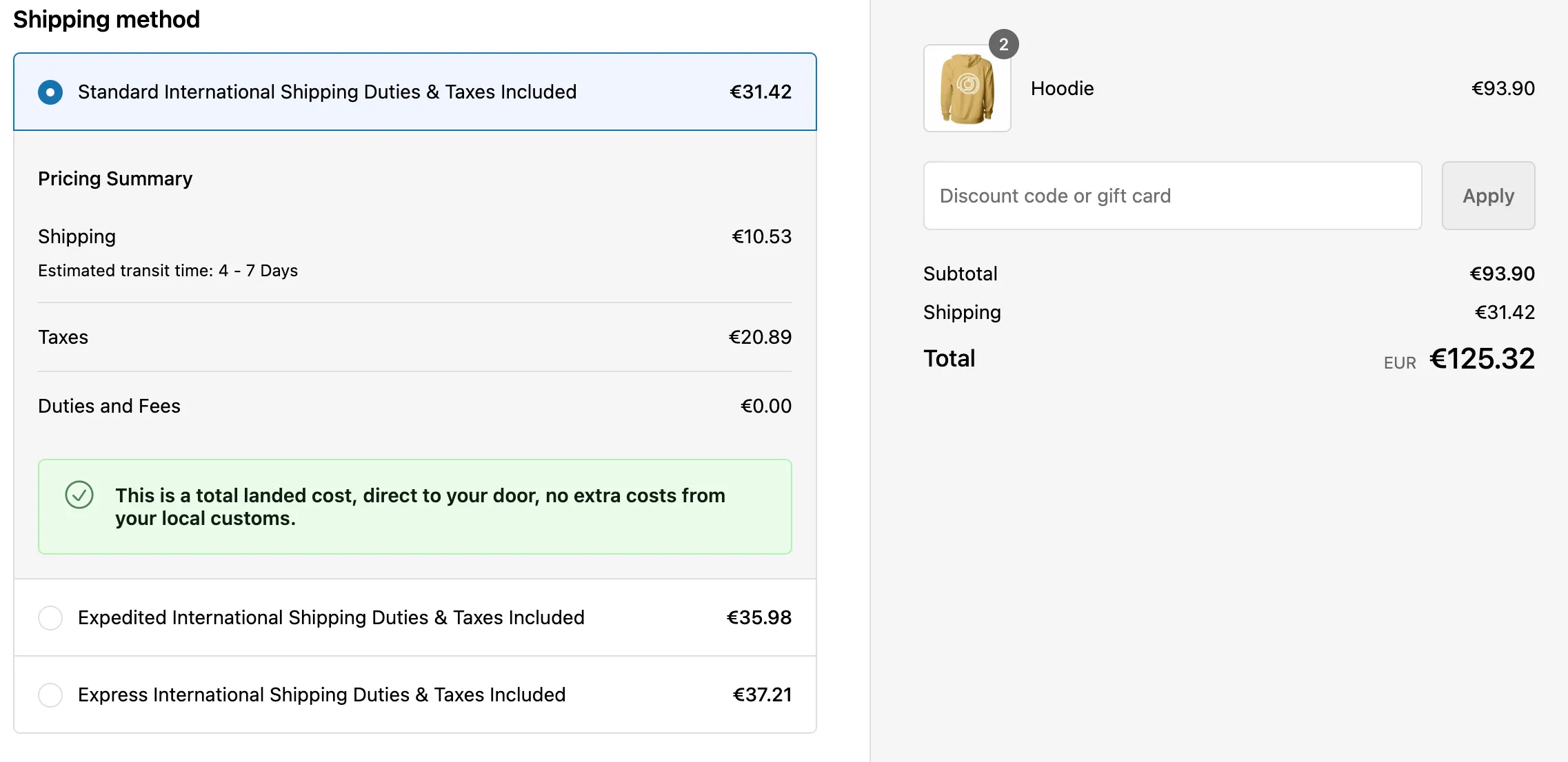 When enabled, the enhanced duties and tax breakdown will expand the selected shipping option to display the duties and taxes separately from the shipping cost. Shoppers will be able to see a breakdown of the shipping cost, duties, taxes, and transit time before they complete their purchase.